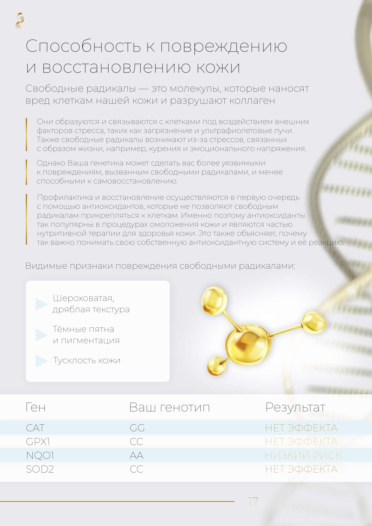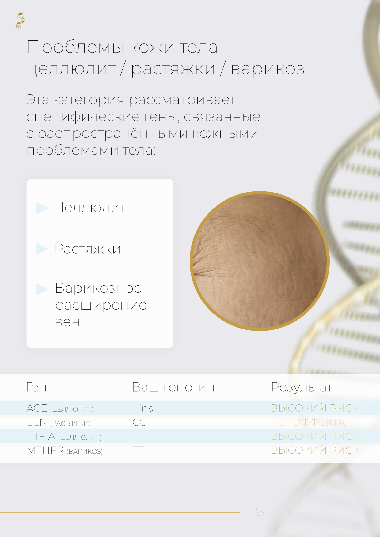 +7 (843) 500-51-40ДНК-тест Skin Care (генетика красоты) помогает понять, как именно ваши гены влияют на состояние кожи и волос. Это не медицинский диагноз, а персонализированный генетический отчёт, который показывает врождённые особенности организма и даёт рекомендации по уходу.